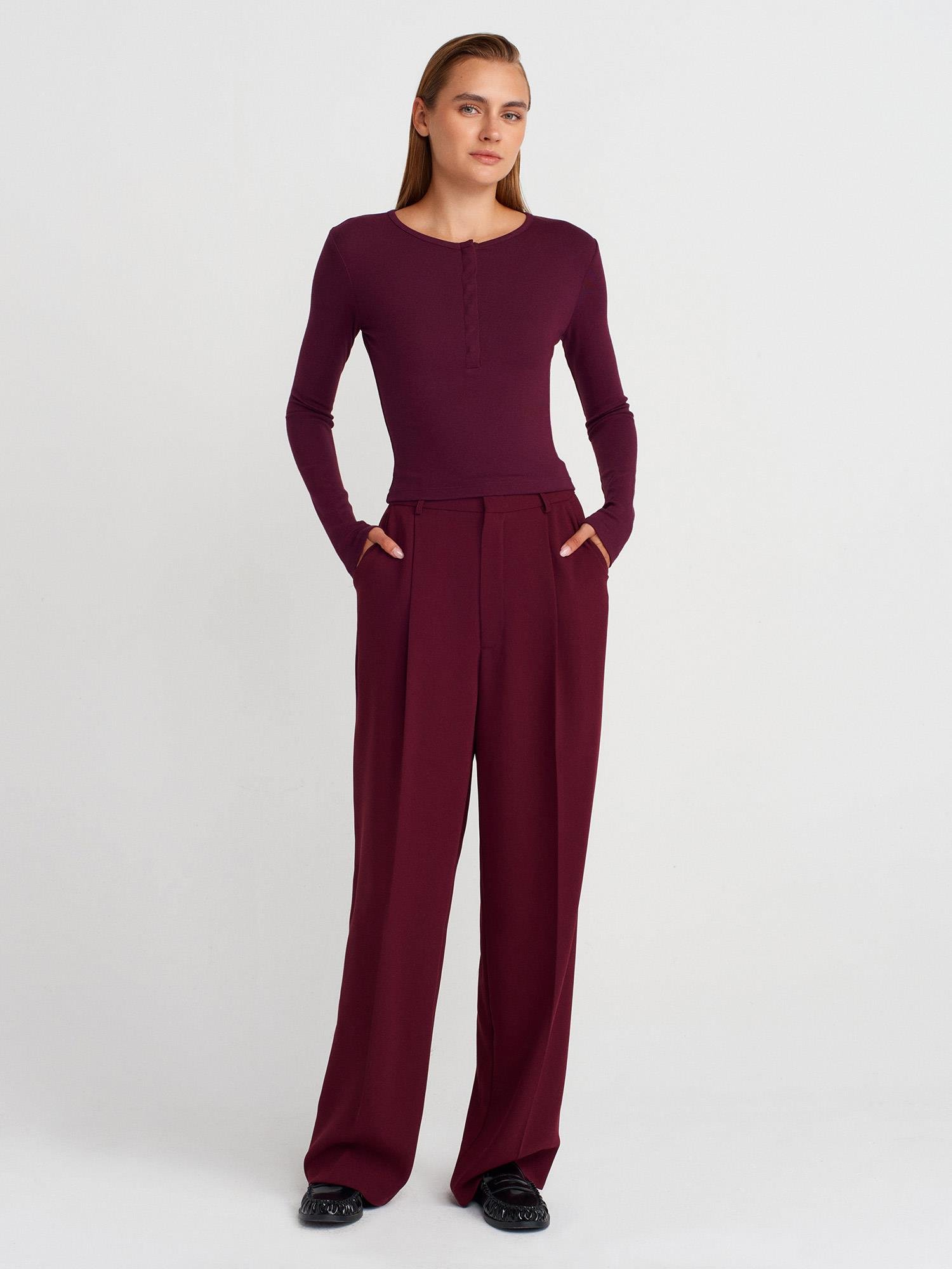 31442 Uzun Kollu Çıtçıt Düğmeli Top-Bordo