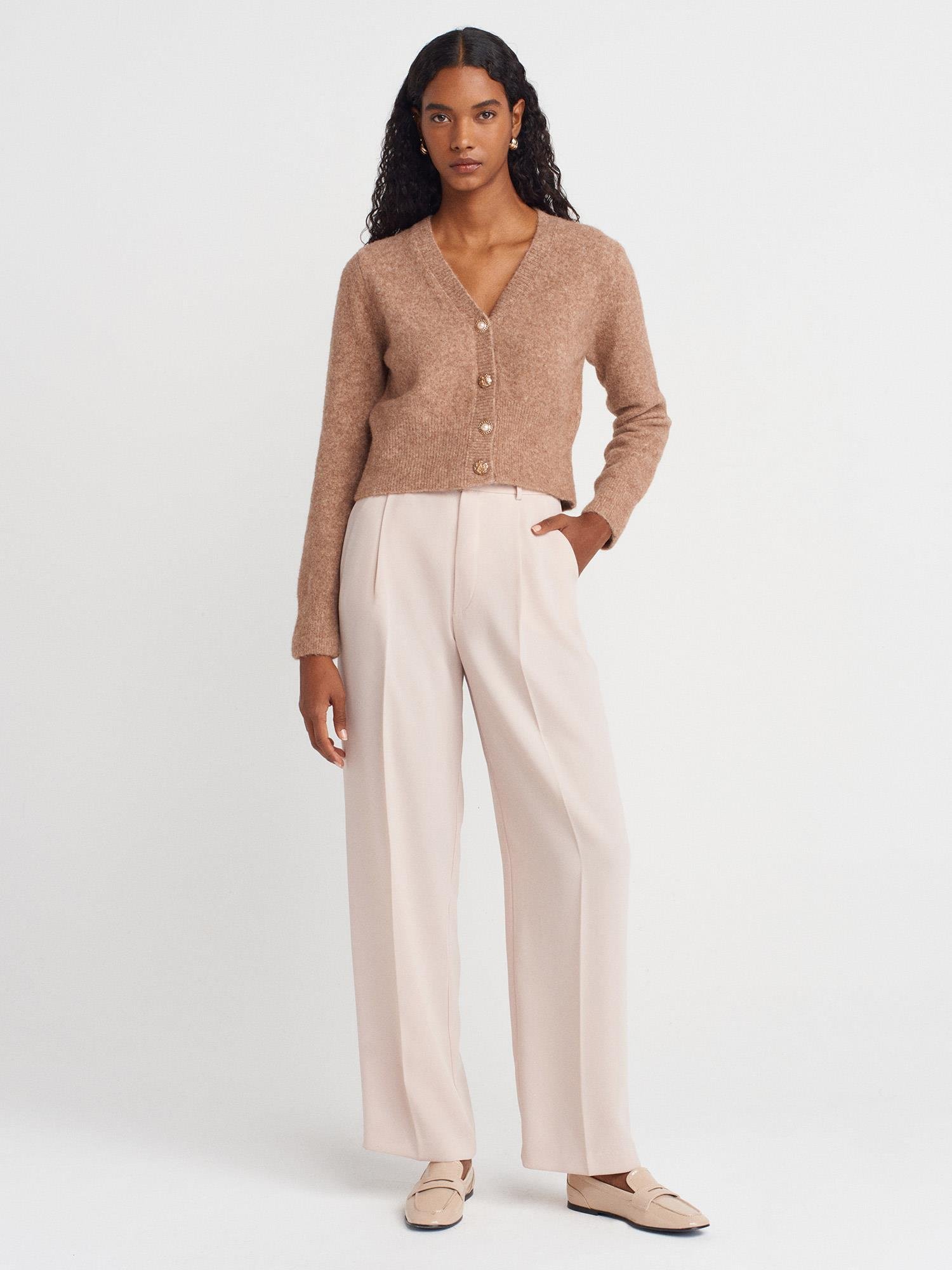 60273 V Yaka Düğmeli Triko Hırka-K.Bej Mel.