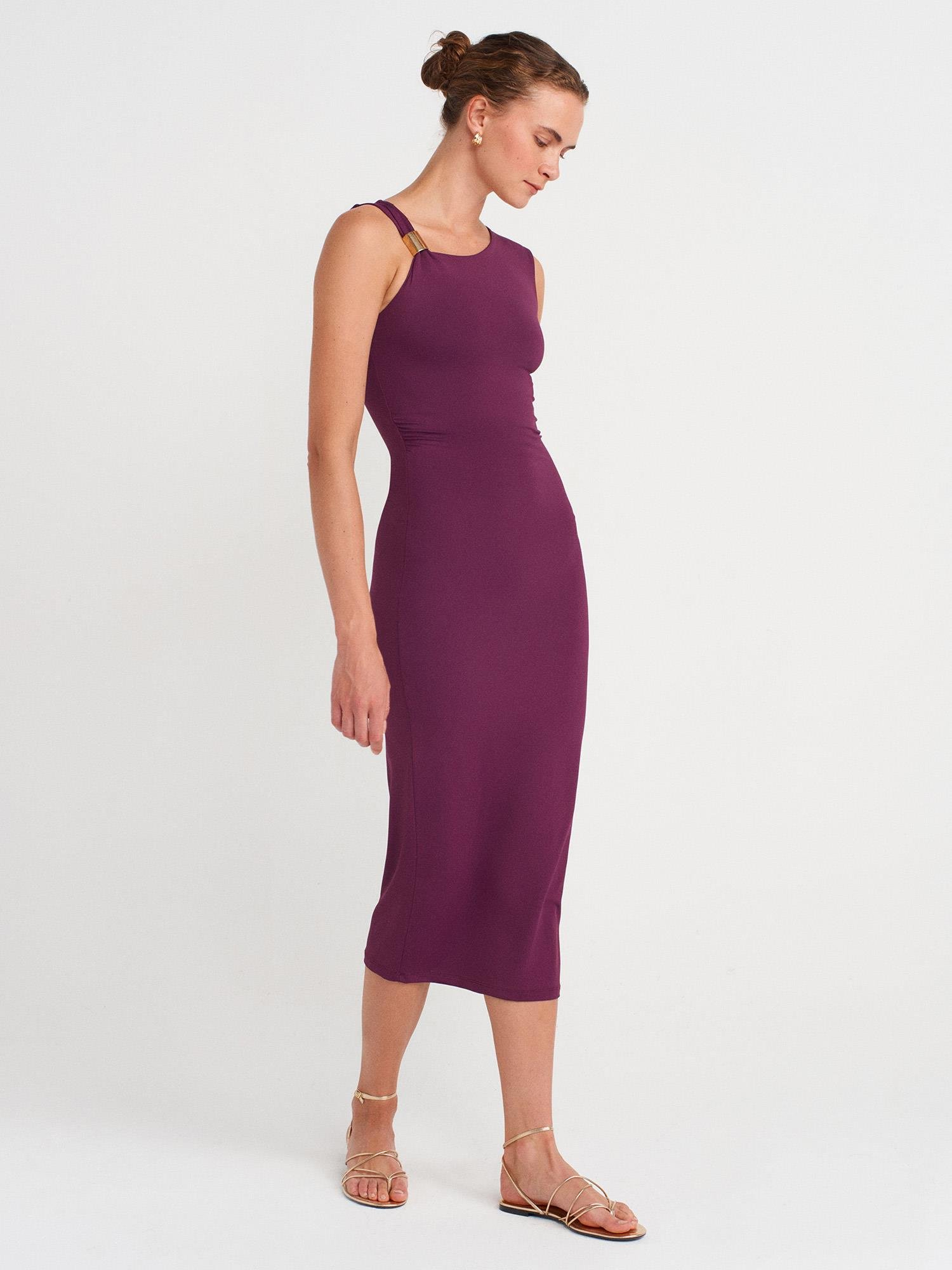 91493 Aksesuar Detaylı Asimetrik Elbise-Mor
