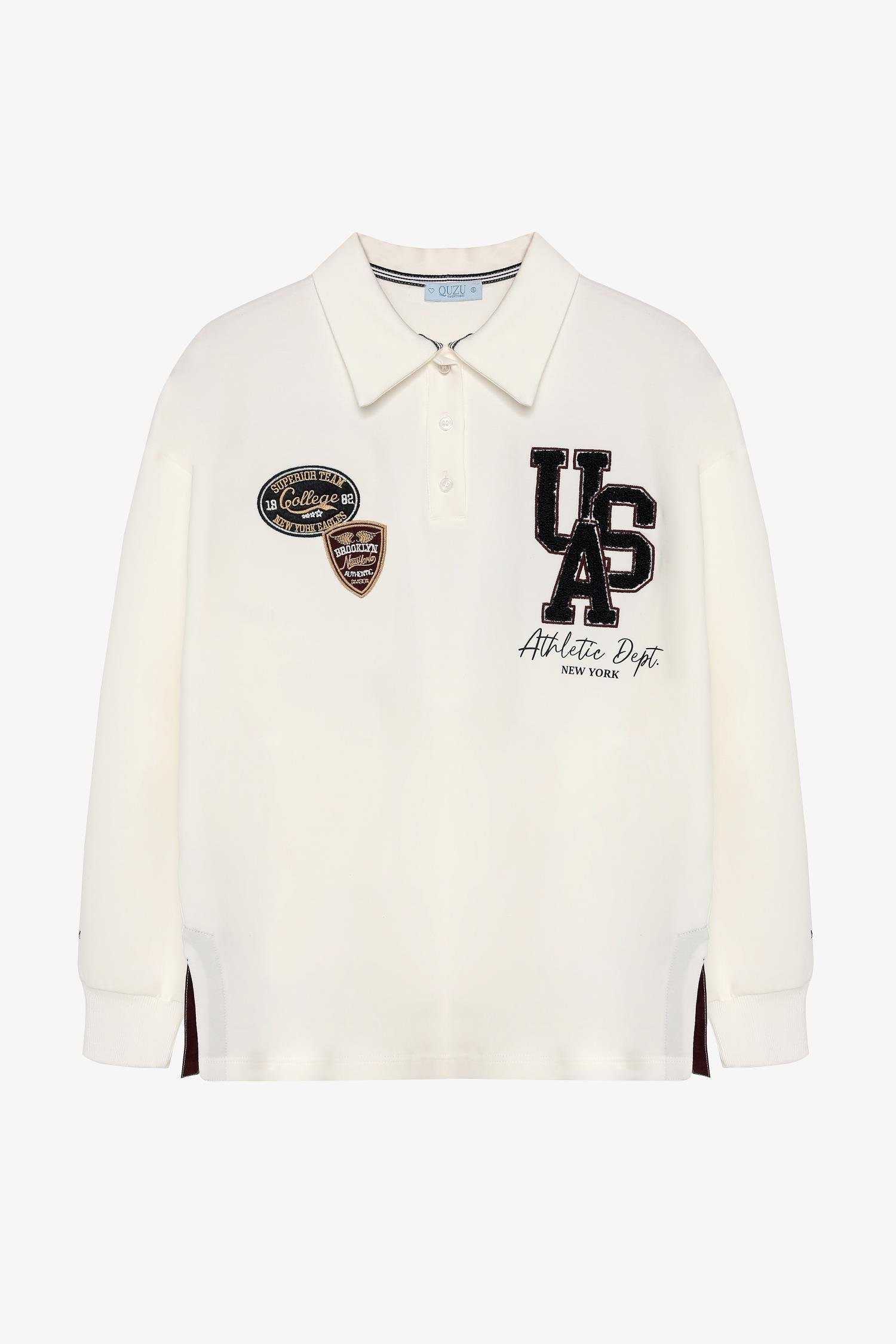 Arma Nakışlı Polo Yaka Oversize Sweatshirt -Ekru (26KSWT00962)