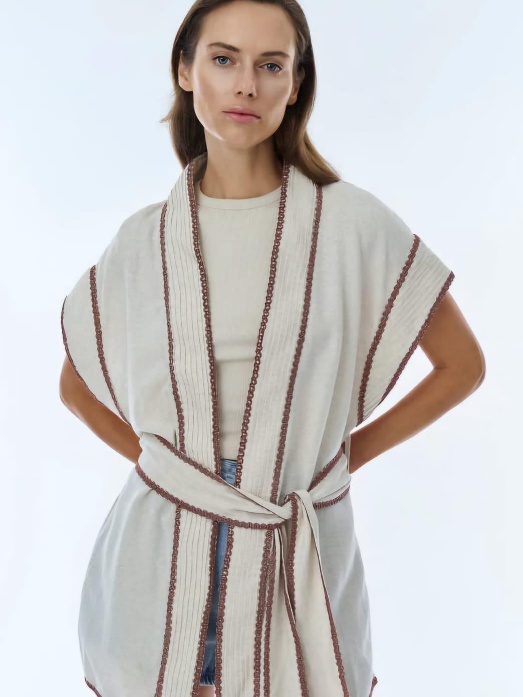 İşleme Detaylı Bağlamalı Keten Kimono Naturel
