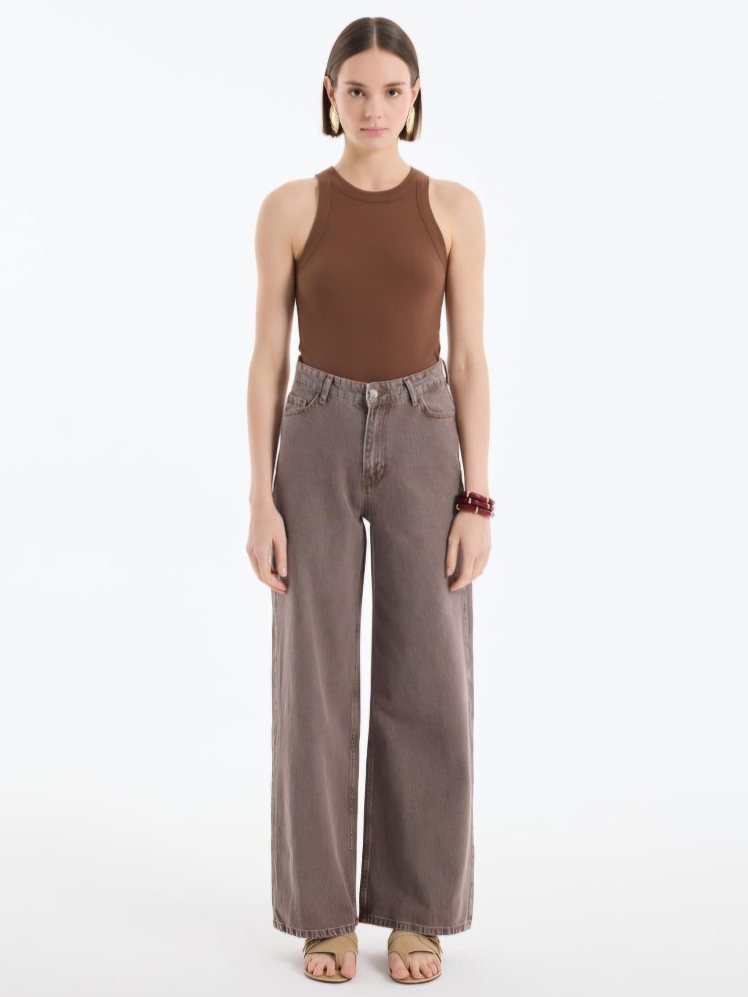 Yüksek bel, çift cepli, yıpratma efektli, sportif ve konforlu görünüm sunan geniş paça denim pantolon.