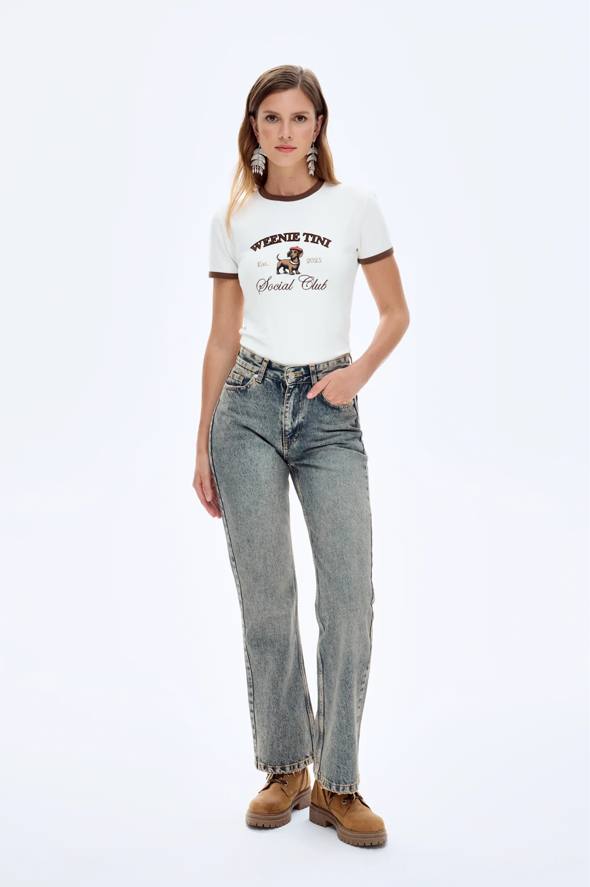 Yüksek bel, düz paça kesim, cepli, yıkama efektli, fermuarlı ve düğme kapamalı, kot pantolon.